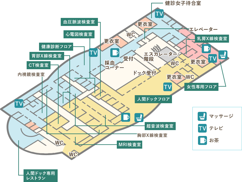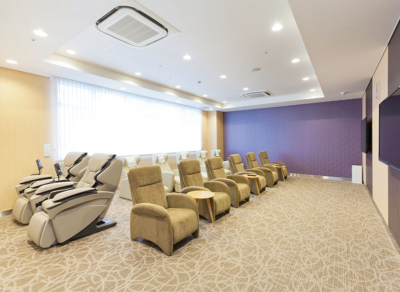 - 人間ドックフロア大きな窓から光が差し込む空間。ゆったりと過ごせるよう、ソファやマッサージチェアを備えています。