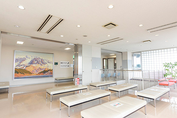 - ロビー広々とした空間に、大きな絵がお出迎えします。左手が健診フロア、真っすぐ奥に進むと人間ドックフロアです。