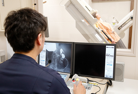 空腹の状態で、発泡剤とバリウム(造影剤)を飲み、検査台のうえで体の向きを変えながら、X線を使って胃を観察する検査です。