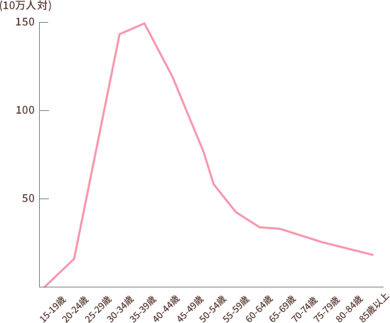 子宮頸がんは20代前後から罹患数が増え、ピークは30~40代です。若い女性に多くみられるがんです。