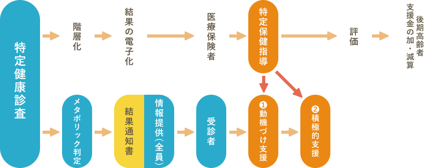 医療保険者が特定健康診査の結果により、メタボリックシンドロームのリスクが高いと判断された人に対し、専門スタッフが継続的に生活習慣改善や健康づくりに関するサポートやアドバイスを行います。