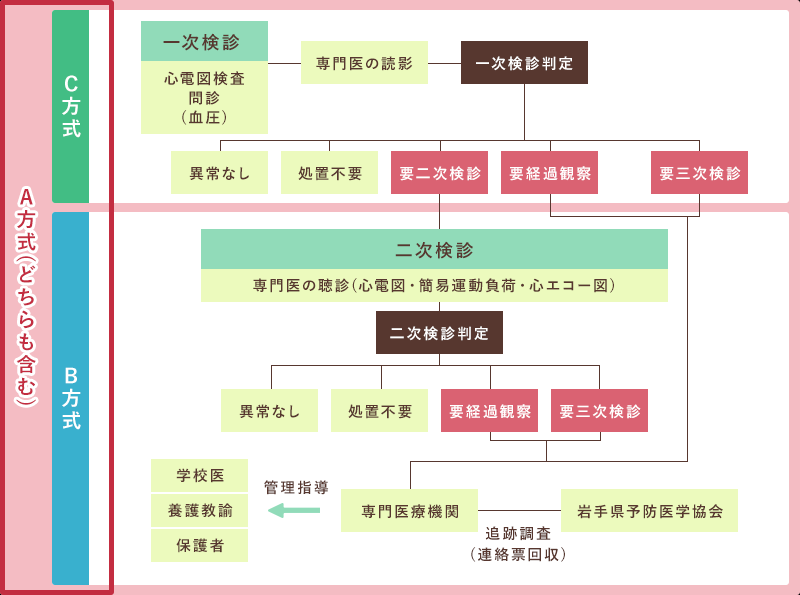 - 二次検診(専門医による聴診、必要に応じて安静心電図・簡易運動負荷・心エコー図)
