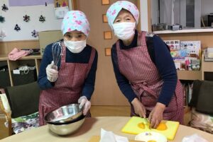 手作りケーキ召し上がれ!(調理レク) クリスマス行事でケーキのデコレーションに挑戦しました。 長時間台所に立つことは少し難しい皆様ですが、包丁さばきはお見事! 果物やクリームをご自分の好みで盛り付けニッコリ笑顔でした。