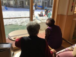 子どもたちに元気を貰います 春とは名のみの寒い日が続きますが、子どもたちは元気元気! 園庭につもった真っ白い雪で思う存分遊んでいます。 微笑ましく見守る利用者さん達に向かって、 「見て見て~!」と自慢げに手を振ってくれました。