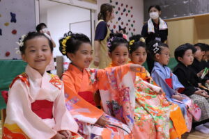 子どもたちは毎日踊りの練習を重ね、本番は晴れ着に髪も可愛らしく立派にお祝いの舞を披露。