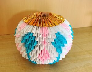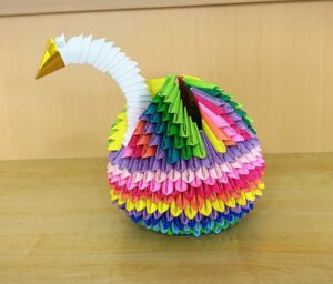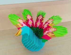 そして今月の折り紙手芸のご紹介です。今月は、孔雀と鶴、そして壷が完成しました。