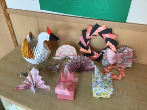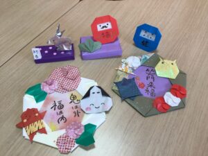 さてお正月は折り紙が流行っています。たくさんのお正月飾りを作って楽しんでいます。