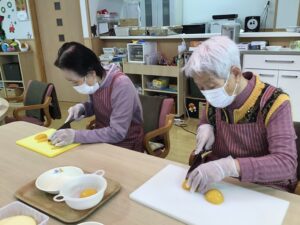 分担して果物を切ります