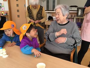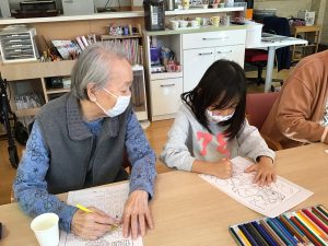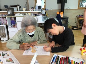 交流の様子 今月も子ども達がたくさん遊びに来てくれました♡ 塗り絵や折り紙を一緒にしたりお話をしたり 楽しく過ごされていましたよ♬ 子ども達自ら利用者さんのお膝に乗ったり抱っこしてもらったり 甘えている姿が可愛らしかったです(^^)