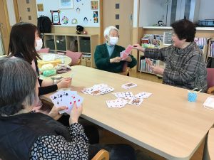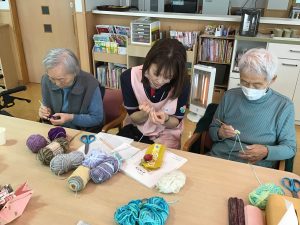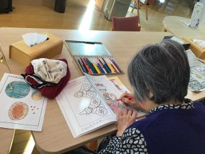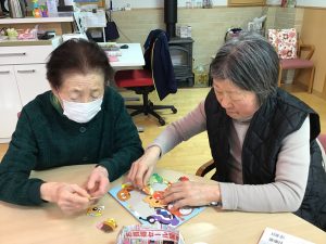 デイサービスの日常 塗り絵やパズル、編み物などで自分の時間を過ごしたり 魚釣りゲームやトランプなどを皆さんと一緒におこない 毎日楽しく過ごしています(^^) お友達も出来るのでお話が盛り上がり、賑やかなCocoaです♬