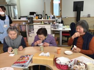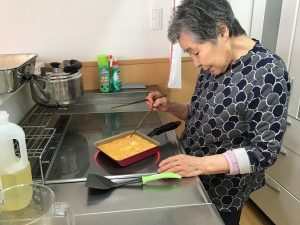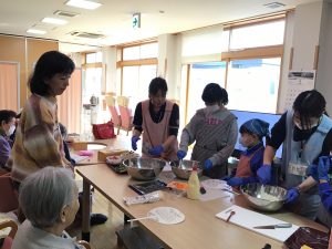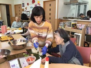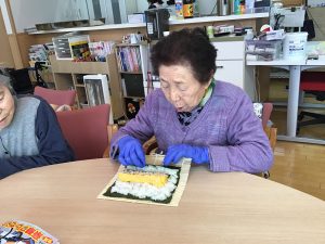 調理レクリエーション 児童クラブのおやつののり巻きを小学生の子ども達と一緒に作りました♬ 卵焼きを焼いたり海苔を巻いたり、皆さん積極的に調理に取り組まれていました! 手作りののり巻きはとても美味しく、好評でした♡