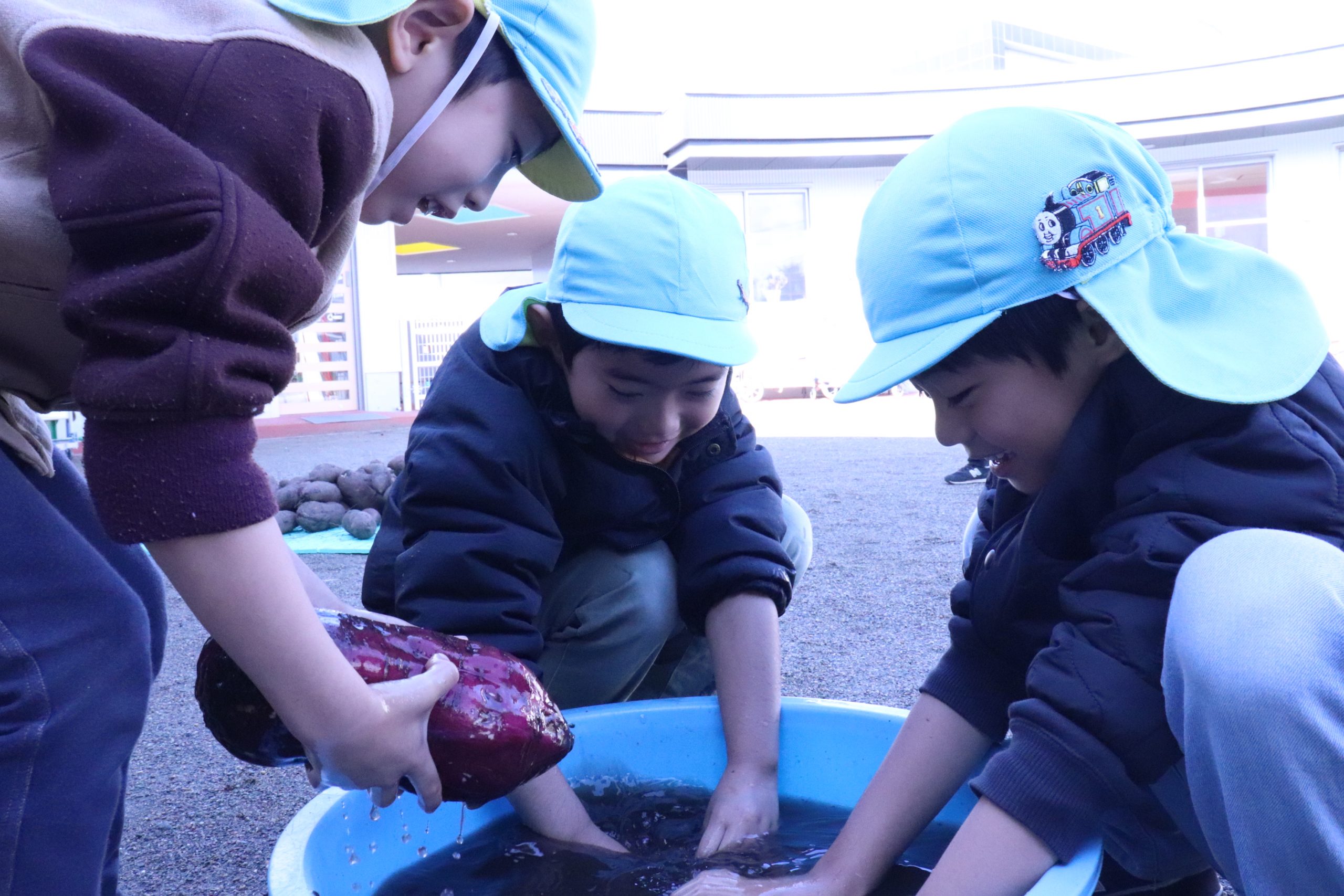 焼き芋会前日には4,5歳児のお友だちで土の付いたサツマイモをきれいに洗ってくれました。2度洗いをし、前日準備はOK!