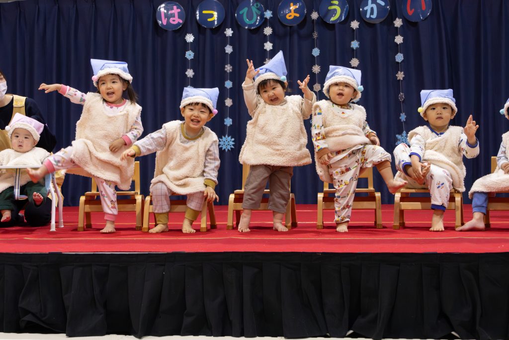 たくさんのお客さんを前にドキドキな子どもたちでしたが、お友だちと頑張りましたよ。かわいい歌声も聞かせてくれました。 ♬ハイホーハイホー♬