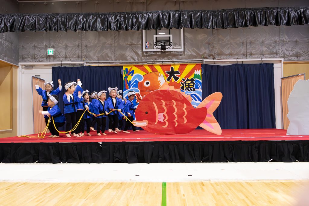 大好きな「おおきなかぶ」の絵本をモチーフにオリジナル作品をお届けしました。みんなで「うんとこしょ、どっこいしょ」大きな魚を釣り上げ大喜びの子どもたちです。