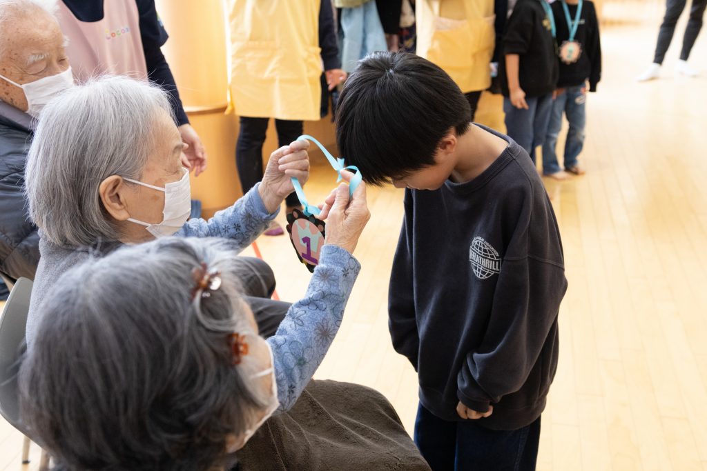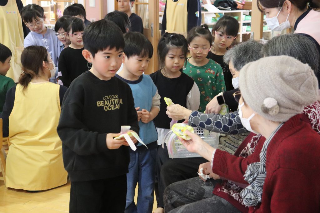 お祝いに来てくれたデイサービスの利用者さんからは卒園式でつけるコサージュをいただきました。卒園式当日はみんなで胸にコサージュをつけ参加しましたよ。