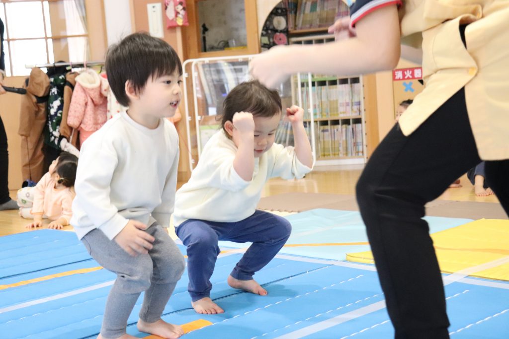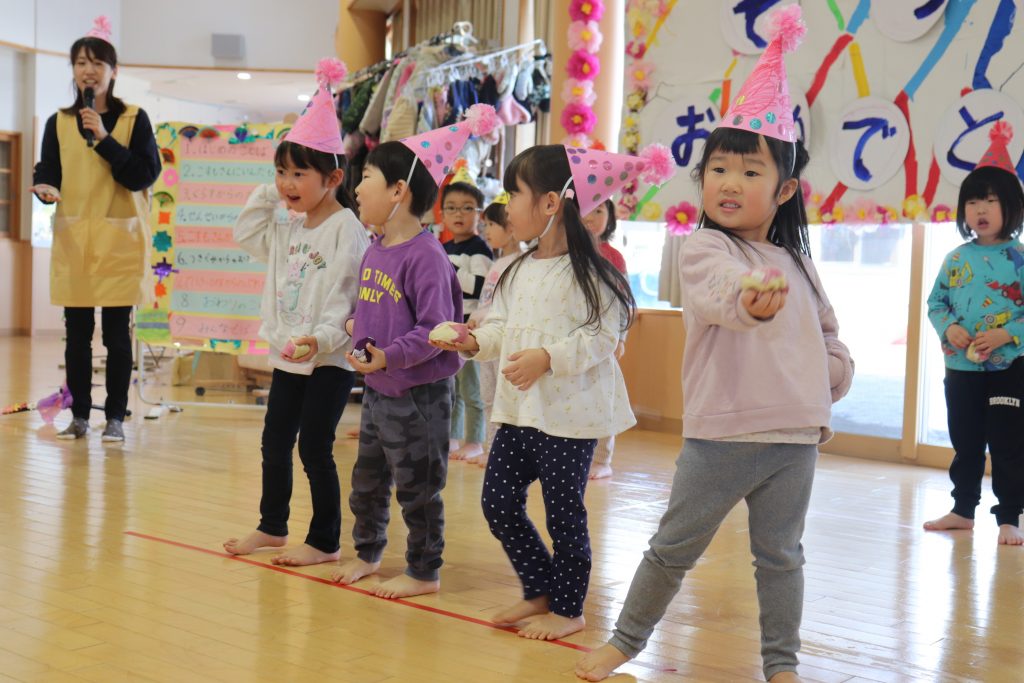 0歳児から4歳児クラスまでみんなでお祝いをし、おめでとうのメッセージや、ありがとうの感謝を込めてステージ発表をしました。
