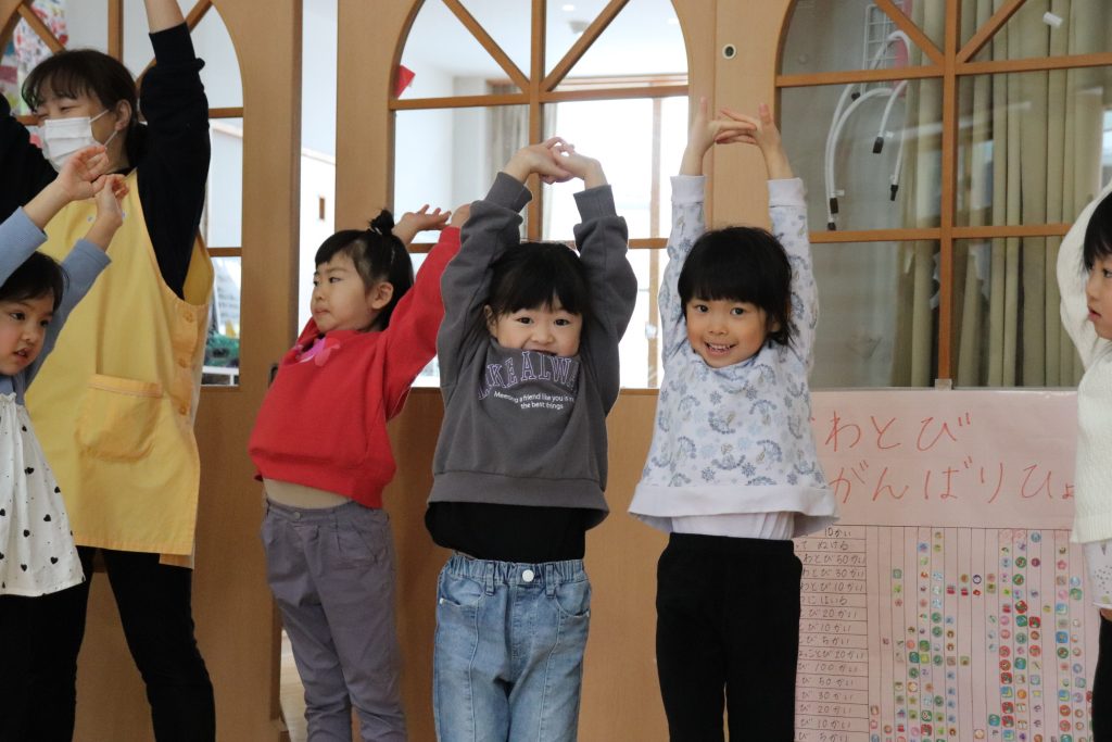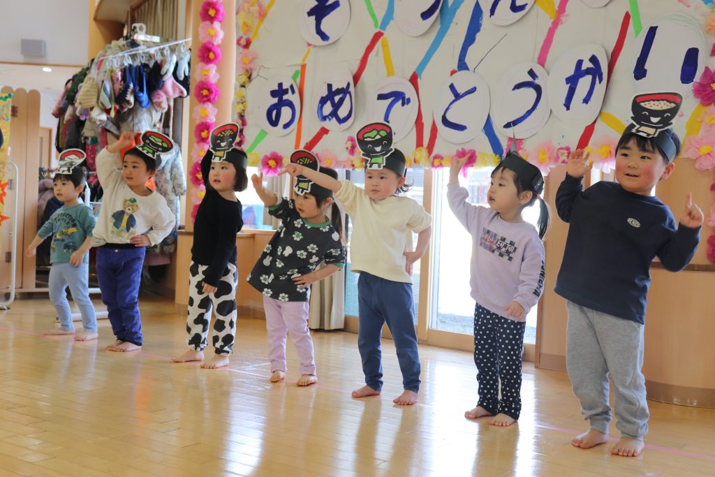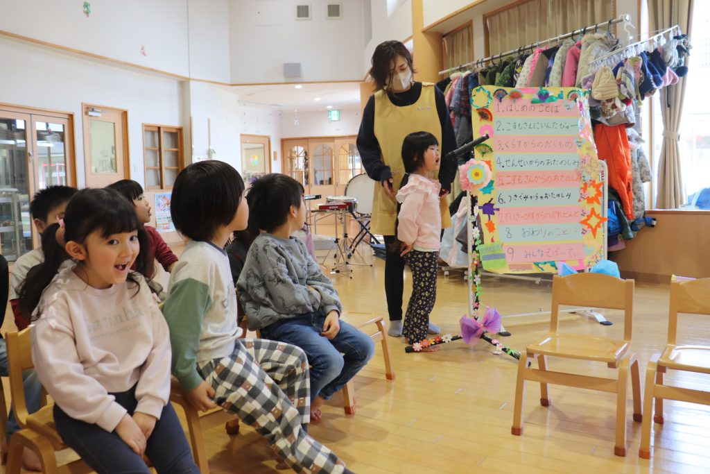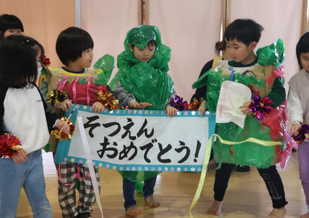 3月11日(火)に年長児の卒園をお祝いして、園内で卒園おめでとう会を行いました。 当日は次の年長組になる4歳児のお友だちが司会進行をしたり、装飾を行ってくれました。