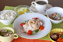 カロリーは650kcal前後、塩分量は3.0g以下を基準にしています。また、エネルギー代謝が効率よく行われるよう主食・主菜・副菜・汁物で構成したバランスのよい食事を提供しています。最初に野菜から食べる事をおすすめします。(満腹感を与えて食べ過ぎを防止します。)